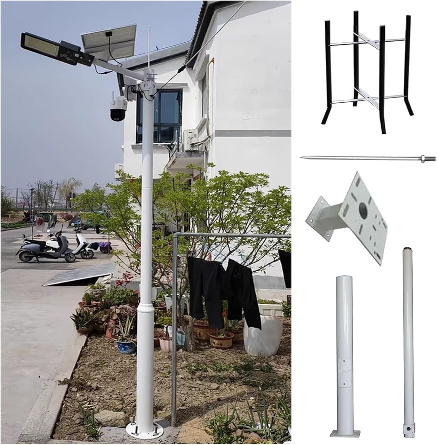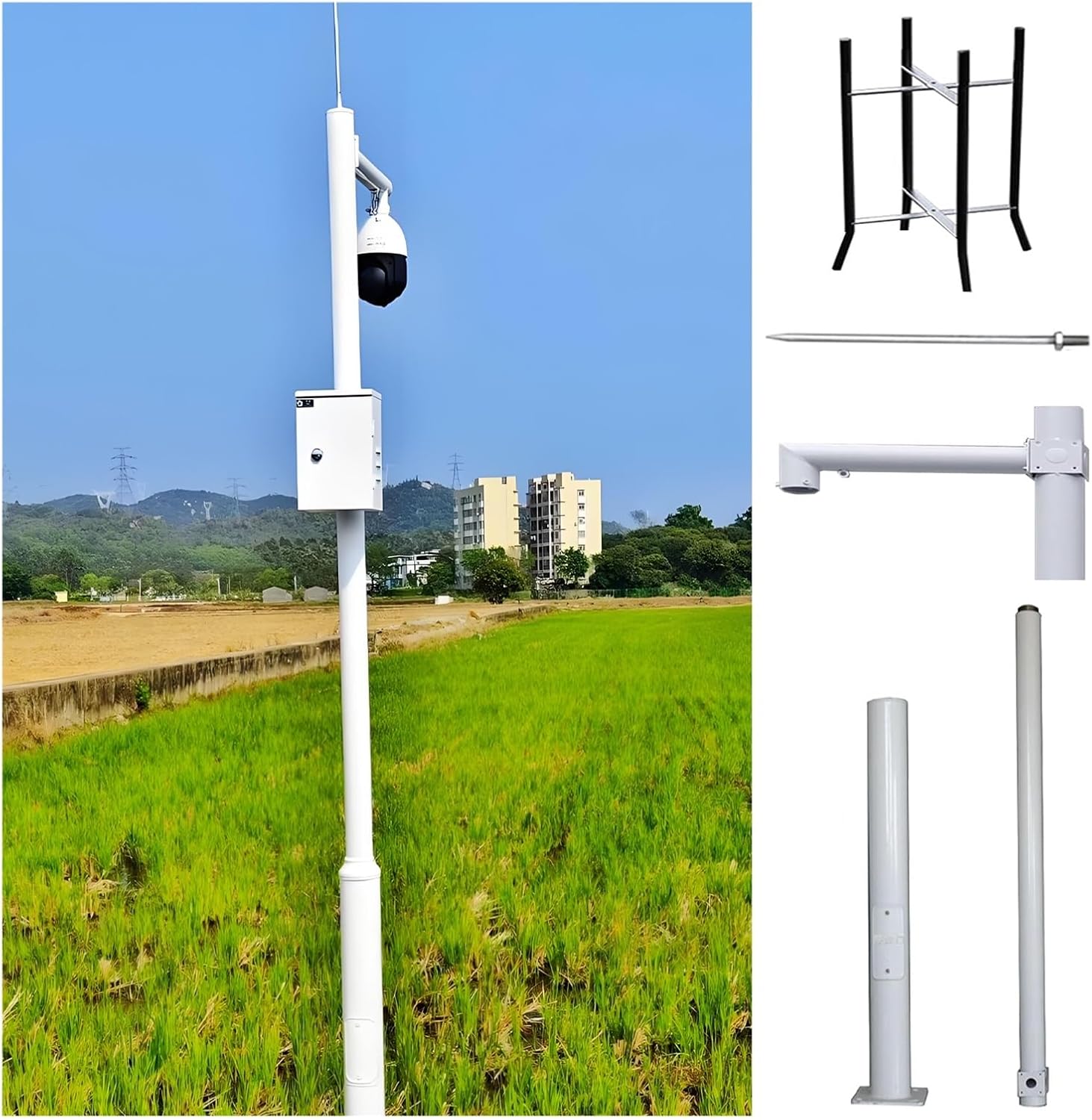 In today's world, ensuring robust surveillance in diverse environments is essential. Our monitoring pole serves as more than just a support structure; it embodies a sense of security for your surveillance systems. Whether you’re securing a bustling city intersection, a lively commercial plaza, or a serene park, this durable monitoring pole is designed to meet your needs.Crafted from galvanized steel, this pole boasts a resilient design that withstands various weather conditions, making it perfect for outdoor use. Its modular construction allows for easy transport and installation, as it can be assembled from 2-3 sections, providing flexibility for your setup. The pole's cross arms can be mounted on all four sides, allowing you to adapt the configuration based on your specific surveillance requirements.Key Specifications:- Material: Galvanized Steel Pipe- Color: White- Lightning Rod Length: 40 cm (15.7 in)- Tube Wall Thickness: 1.5 mm (0.06 in)- Available Heights: 2 m (6.6 ft) to 6 m (19.7 ft) in various section combinations.Features:1. Modular design for easy transport and installation.2. Rust-proof galvanized steel construction for durability.3. Strong and stable structure suited for all weather conditions.4. Versatile cross arm installation for customized surveillance setups.5. Ideal for outdoor scenes such as roads, parks, and plazas.Included in the package:- 1 Security Camera Pole- 1 Ground Base Cage- Mounting ScrewsEnhance your security infrastructure with our reliable monitoring pole, designed to provide a solid foundation for your surveillance equipment while ensuring peace of mind in any environment.