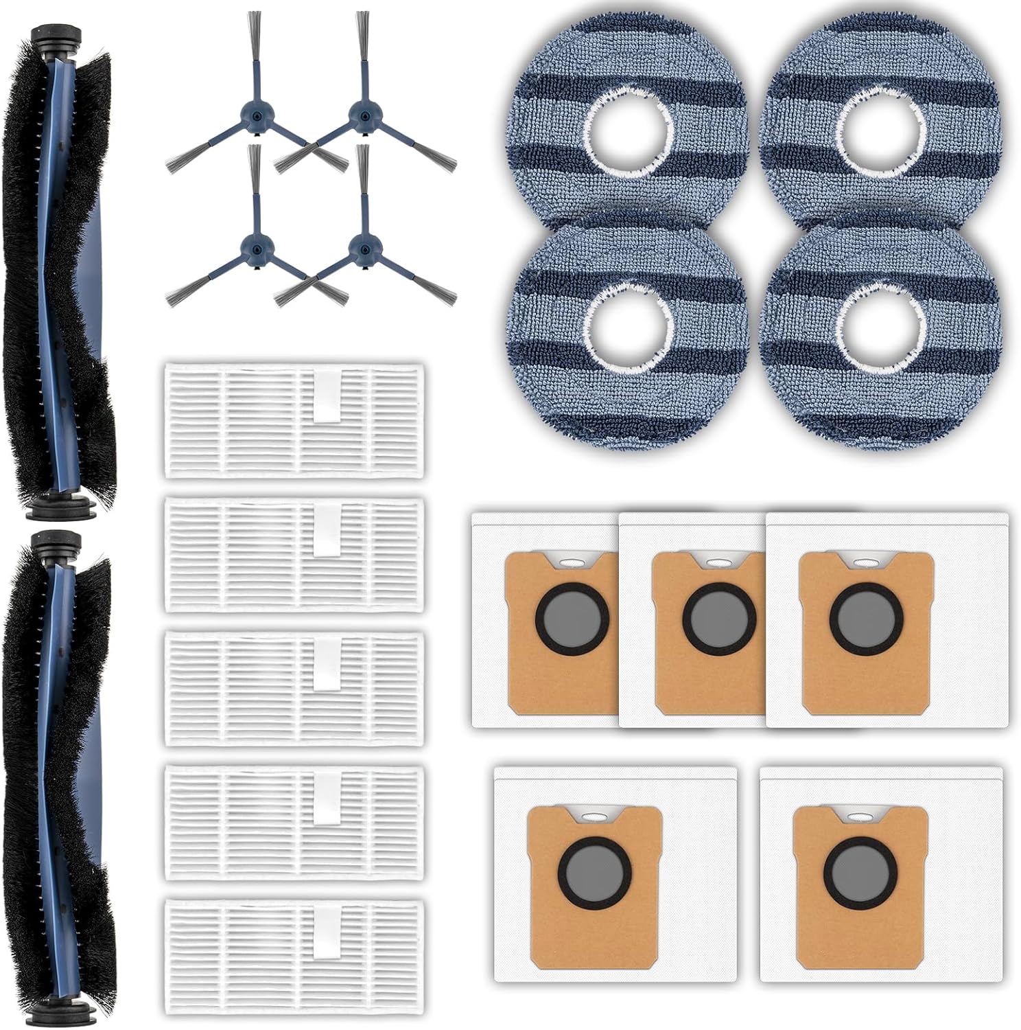 | Included Components | Accessories kit: 30 parts included: 2 Roller Brushes, 8 Side Brushes, 7 HEPA Filters, 7 Dust Bags, 6 Mop Pads/ Perfectly compatible with Eufy C20 Omni Robot Vacuum Cleaner/ Environmentally friendly |