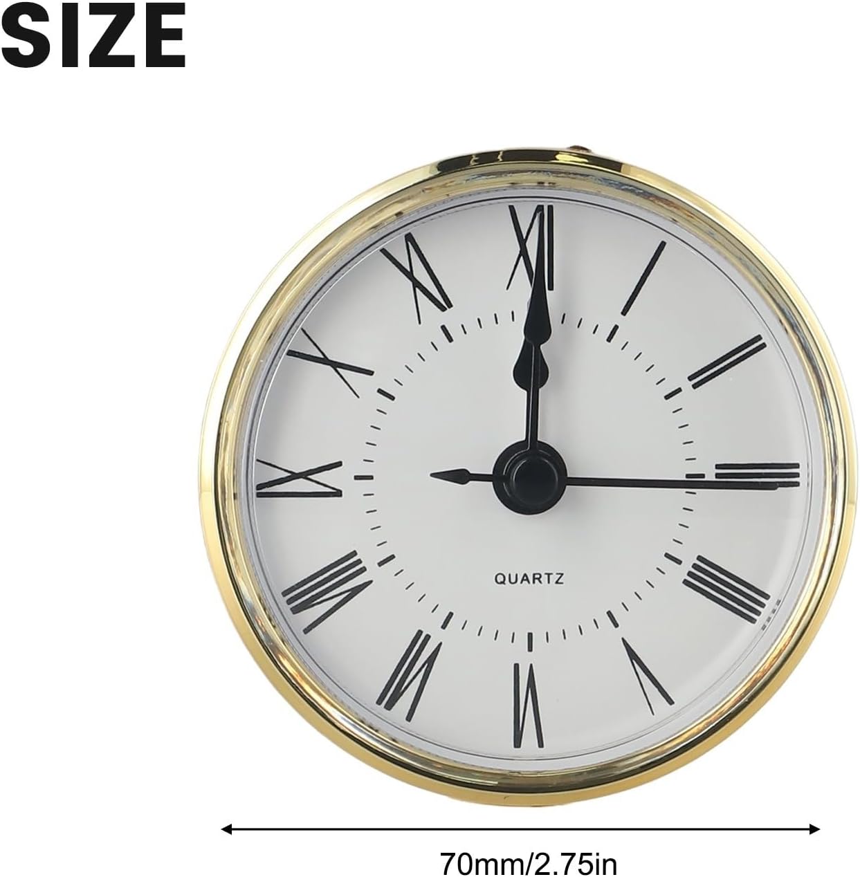Product description Features:and .Roman or arabic numerals on white face, clear lens, gold or silvery colored trim.The clock movement is a for precision, , high .The 70mm diameter quartz clock head is equipped with a rubber for ring, which can be fixed in the clock base.The clock is equipped with a back cover, which can be removed for easy battery installation.It can be used as a DIY clock or for repairing or replacing broken clocks.Specifications:Material: Plastic+metalColor: Gold,Silvery (As Picture Show)Whole Diameter: 70mmTotal heaviness: 30mmBack diameter including rubber for ring: 61mmInstallation depth: 17mmWeight: approx.80gPackage list:1 x Quartz Clock Insert Manufacturer Contact Information no
