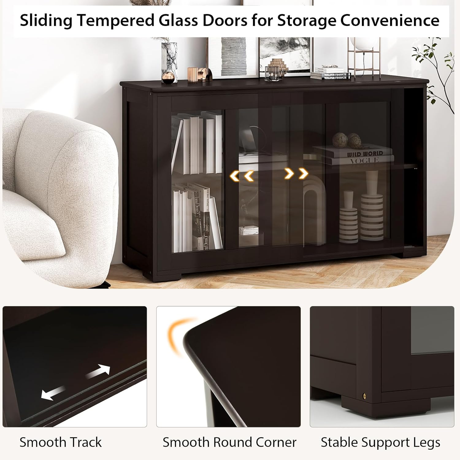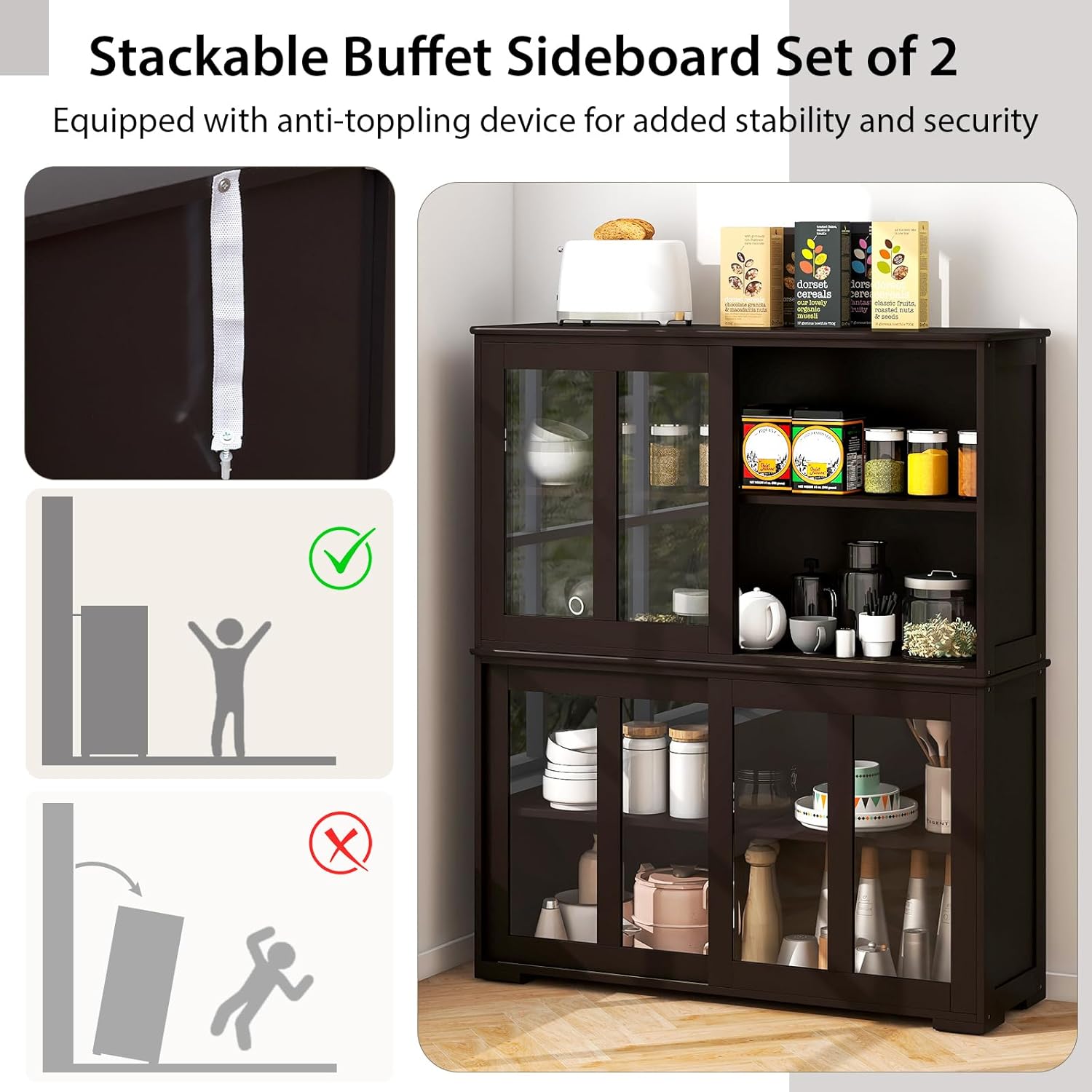 • 【2 Glass Doors & 3-Position Adjustable Shelf】The kitchen cupboard credenza has 2 tempered glass doors, which not only helps to display decorative items, but also protects the stuffs from outside dust. And the 3-position height adjustable inner shelf allows you to reasonably customize the upper and lower space.