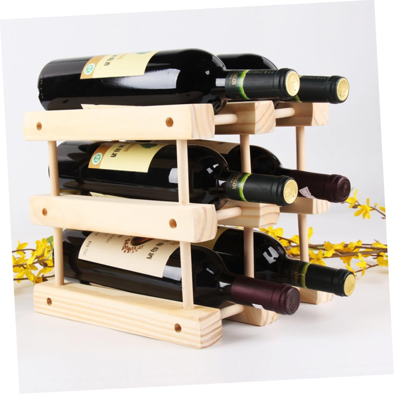 Package Include 1 x wine rack Features - Warm Tip: Dear buyer, Due to lighting effect, monitor's brightness, manual measurement and etc, there could be some slight differences in the color and size between the photo and the actual item. Sincerely hope that you can understand! Thank you! wood wine rack - Size: Approx. 26 x 22.5 x 22.5cm wine rack. - Material: Wood wine racks countertop. - You can keep multiple bottles on display in a relatively small area, you are valuable countertop space wine bottle holder. - For any wine lover in your life, this wood display rack is sure to be a present they'll love wood wine holder. - The unique design of this wine rack will not tip or topple. Each bottle of wine in your collection can have a place of in this convenient, attractive display. - ColorKhaki - Unlike other wine racks or storage cases that may allow only for vertical display and storage, this rack keeps each wine bottle cradled in convenient horizontal storage. This keeps the wine fresh and flavorful for a longer period of time, giving you and protecting your wine investments.Goods Informationwood wine rack With simple design, it fits in well with a wide variety of design themes, that it can simultaneously secures up 6 bottles of wine.wine rack This wine rack is stylish, yet subtle, and lends an elegant, minimal flair to any kitchen or countertop space.wine bottle holder sized for kitchen counter top