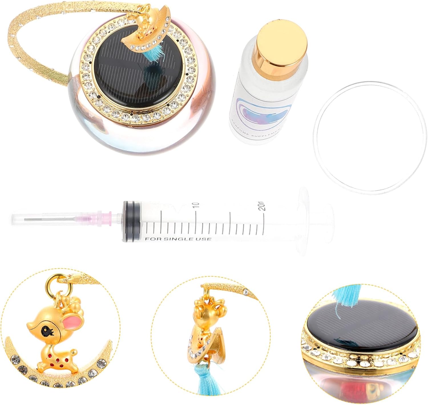 Package Include 1 x Adornment 1 x 50ML Refill 1 x Essential Oil 1 x Specification 1 x Anti-slid Pad Features -Material: Alloy, Glass, Solar Panel car refresher. - The excellent workmanship of our product will bring you a . The product is durable to use scented car . - The product can be given as a good present to your friends, which makes them feel happy all the time dashboard decorations. - The excellent manufacturing process enables it to have . The product has practical functions Car Perfume Ornament. - Adoption of , sturdy and durable for long-term use. will refresh the air inside the Interior Decor. - Beautiful appearance ,small space, a nice decoration for your car. The product has fine workmanship car decoration.Goods Informationaroma diffuser decor This item is a perfume adornment, manufactured with for durable and use.Car Interior Decor It is perfect for the car interior decor, which is a perfect New Year present for your friends and family.Car Aroma Ornament It can be used to decorate your car, etc