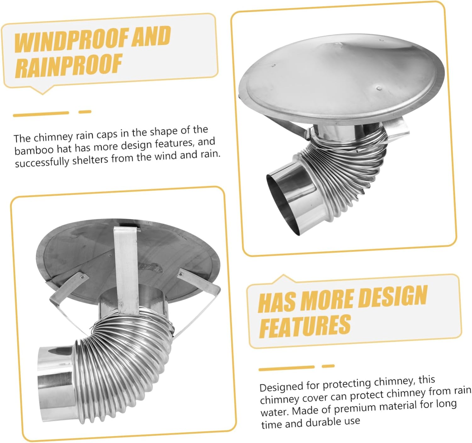 Package List 1 cover 1 x tube Characteristics -Color:Silver Smoke Funnel Cover -Size:29.00X29.00X29.00cm/11.40X11.40X11.40in Chimney Cover Suitable chimney diameter: within 24cm Funnel Protector -Material:Stainless steel Smoke Tube Cover - This is a rainproof cover, it can help to prevent the rain get into the room through the chimney Roof Vent Rain Cover. - It is characterized by a sturdy and reliable texture, not easy to break, serving you for a long time Chimney Cover Accessory. - Bend the brackets downwards, get a thin iron wire through the hole on the brackets and wrap it onto the chimney Chimney Weatherproof Cover. - Suitable for garden, home decoration, fireplace chimney windproof, rainproof and snow proof Ducting Ventilation Cover. - Every detail is carefully crafted, experience the high durability and practicality Chimney Rainproof Cover.Goods Descriptionchimney rain cap It is made of solid materials.Roof Round Exhaust Caps This product is a chimney cover.Chimney Cover Accessory It is an excellent chimney cover that can bring you convenience, allowing you to have a more comfortable experience.Durable Roof Vent Caps It without being easily damaged.Exhaust Vent Cover It is safe and durable