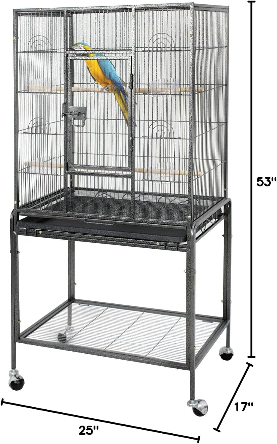 Are you looking for a bird cage suitable for Cacique, Conures, Jardine's Parrot, Meyer's Parrots, rots us, Poicephalus, red-bellied or Other Similar Size Birds? This Birdcage will suitable for you! Feature: Solid strong metal frame for years' use An ideal decoration in flower shops Easy to assemble,include all necessary accessories 2 interior long wooden perch for resting, higher view available 4 feeding transparent cups for food and water 4 strong swivel casters mobility and stability, easy glide non-marking casters for conveniently Specification: Color: Black Size: 25"(W) X 17"(D) X 53"(H) Material: Iron Overall Height Including Stand: 53" Bar Spacing: 1/2'' Hight Without The Stand:30.7'' Package Includes: 1 x Cage Main Frame 1 x Cage stand 1 x Metal Trays 2 x Wooden Perches 4 x Swivel casters 4 x Bowls