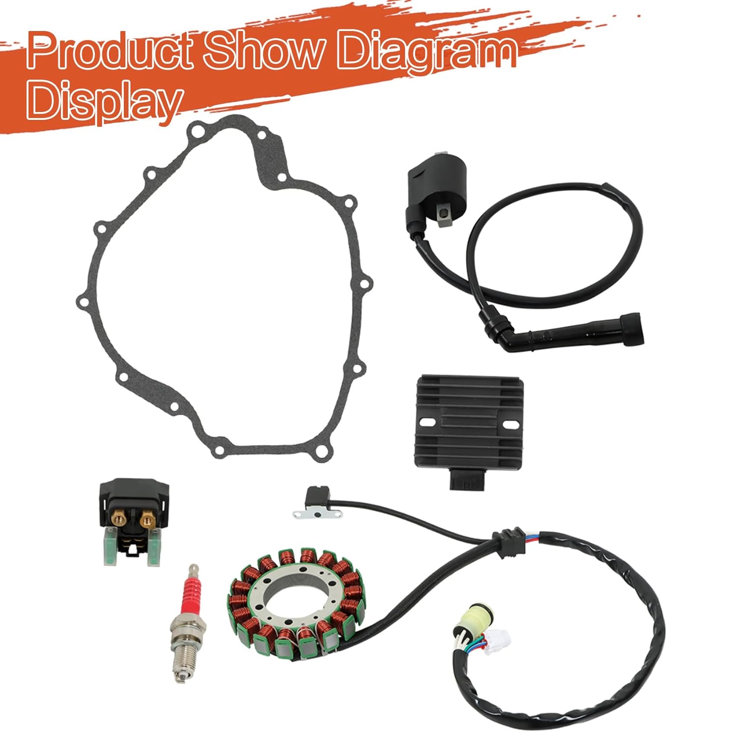 • Includes: 1 x Stator, 1 x Regulator, 1 x Gasket, 1 x Ignition Coil, 1 x Starter Relay, 1 x Spark Plug