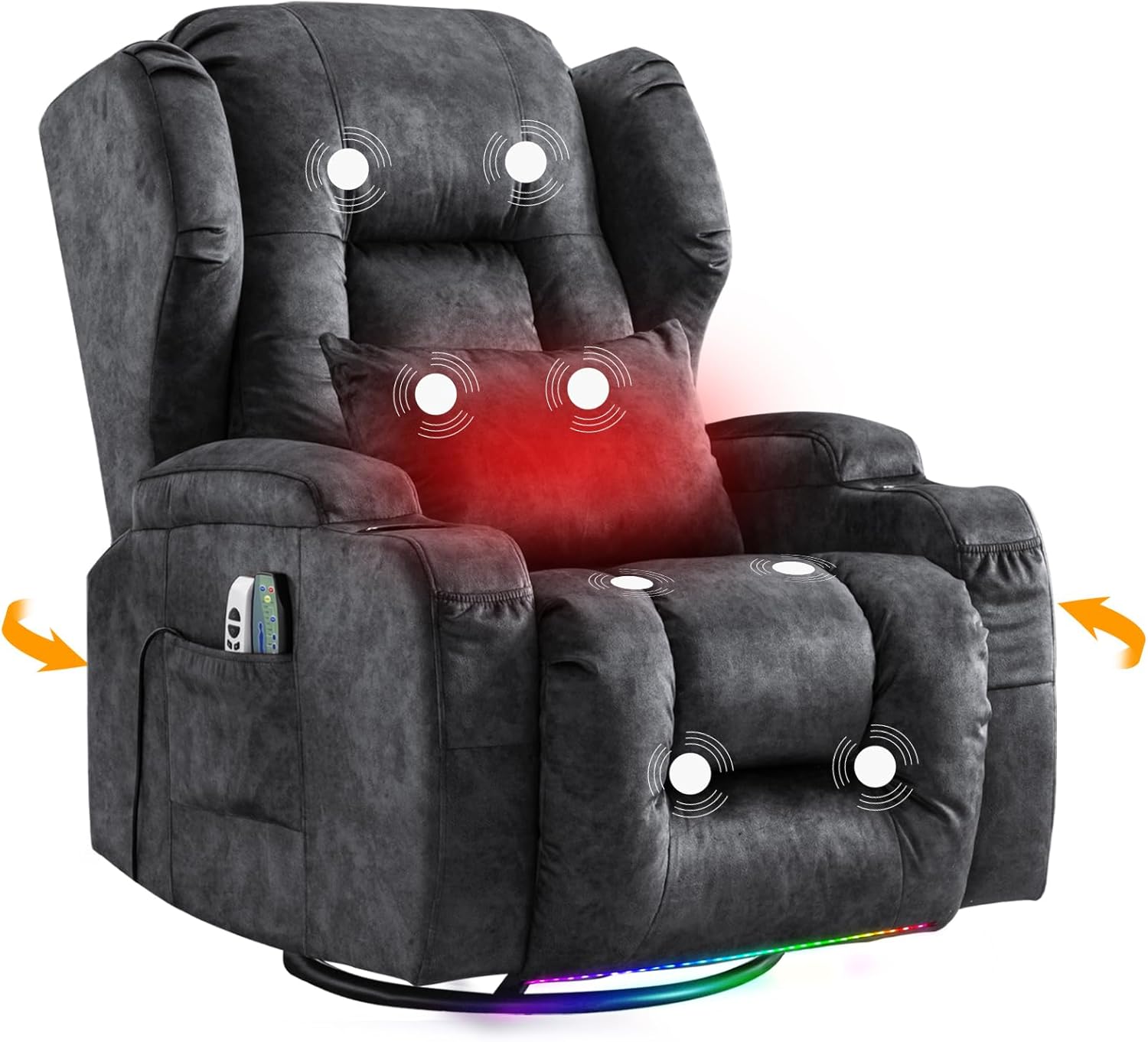 Unwind in Ultimate Comfort with Our Power Recliner Swivel ChairAfter a long, busy day, treat yourself to the relaxation you deserve. Whether you're craving a cozy movie night, indulging in some light gaming, or simply looking for a peaceful moment to rest, our Power Recliner Swivel Chair is your perfect companion.Key Features:Ambient Lighting Options: Create the perfect atmosphere with multiple color settings to match your mood.USB Charging Port: Keep your devices powered up without having to leave your chair.Dual Cup Holders & Side Pockets: Keep drinks and remote controls within easy reach for convenience.Massage & Heating Functions: Soothe tired muscles with various massage settings and a built-in heating function for ultimate relaxation.Luxuriously Soft, Breathable Fabric: Experience all-day comfort with breathable, skin-friendly upholstery that’s both soft and durable.Retractable Footrest: Easily extend the footrest for enhanced comfort and support when you need to kick back and relax.Solid Wooden Frame: Designed for durability and long-lasting strength, our sturdy frame can support up to 330 lbs.Tool-Free Assembly: No screws required—this chair is incredibly easy to assemble so you can start enjoying it right away.Product Care: To keep your chair looking like new, simply wipe down with a damp cloth and mild soap solution. For best results, use a white, lint-free cloth.