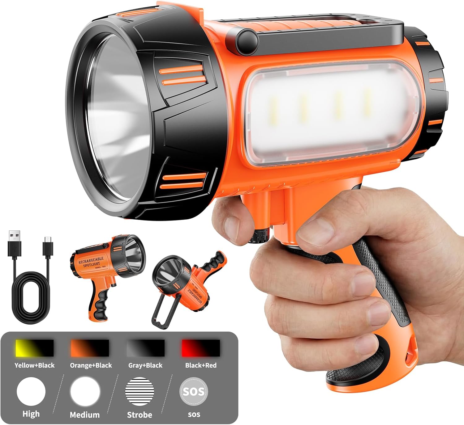 | Additional Features | Anti-slip grip water repellent rechargeable, Camping lighting, boating flashlight, hunting floodlight, hiking emergency light, outdoor snatch light, Car lighting flashlight, night market stand light, outdoor work light, Power Outage Light, Drop Water Emergency Flashlight, SOS Rescue Hand |