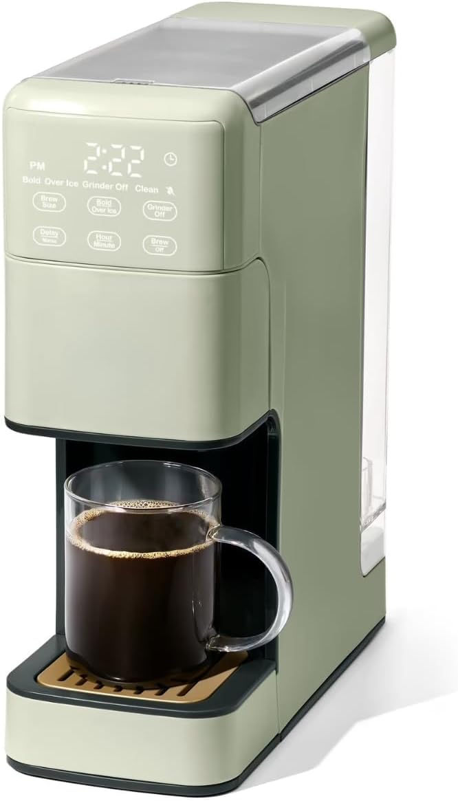 Enjoy the convenience of freshly brewed coffee with this single serve coffee maker with built-in grinder, designed to deliver rich flavor and aroma in every cup. The integrated grinder allows you to brew directly from whole coffee beans, ensuring a fresher taste compared to traditional coffee machines that use only pre-ground coffee. For added flexibility, the machine also works with ground coffee, giving you the freedom to choose your favorite blends and roasts. The programmable coffee maker function allows you to schedule your brewing time in advance, making it easy to wake up or start your day with a fresh cup ready to enjoy. This feature is perfect for busy routines, providing the convenience of an automatic single serve coffee machine that fits seamlessly into your daily lifestyle. Designed for single cup brewing, this coffee maker prepares just the right amount for one serving, helping reduce waste while ensuring every cup is hot and freshly made. The system is ideal for personal use at home, in small kitchens, apartments, dorm rooms, or office spaces where a compact coffee maker is the perfect solution. With a space-saving design, this coffee machine fits comfortably on most countertops while still offering powerful functionality. Combining fresh grinding, programmable brewing, and versatile compatibility with whole beans or ground coffee, this single serve coffee maker with grinder is an excellent choice for coffee lovers looking for convenience, freshness, and consistent results every day.