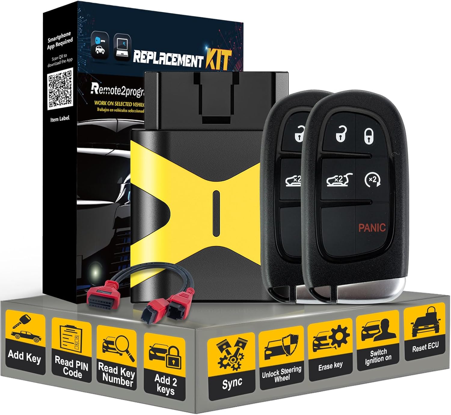 **No Working Key? Need to program the key? **Our Kit uses state-of-the-art technology and is the first one on the market capable of programming smart keys.You just program it at home though you don't have one working remote, It can add 2 keys within 5-10 min, and get new key without paying expensive fees. Paired with keys to give you more peace of mind.Act quickly!!!!NOTE:1. Before you buy it, Please make sure that your original FCC, chip and Buttons are the same as our product in case of money lose.2. No need to cut emergency key blade to program.3. Keep working remotes away from car before programming.4. Read pin code firstly and record it for later use.5. Press and release the unlock button twice, repeat this operation until the key programming is completed.6. 2018+Dodge needs a 12+8 cable adapter to connect the device and vehicleThis remote is replacememnt forFCC ID: GQ4-54TCHIP: 4AFrequency: 433MHZCompatibility :For 2018-2020 Jeep ChrokeeDisclaimer: Remote2program Kit is only used by car owners to program their own vehicles, and other actions are not affiliated with Remote2program