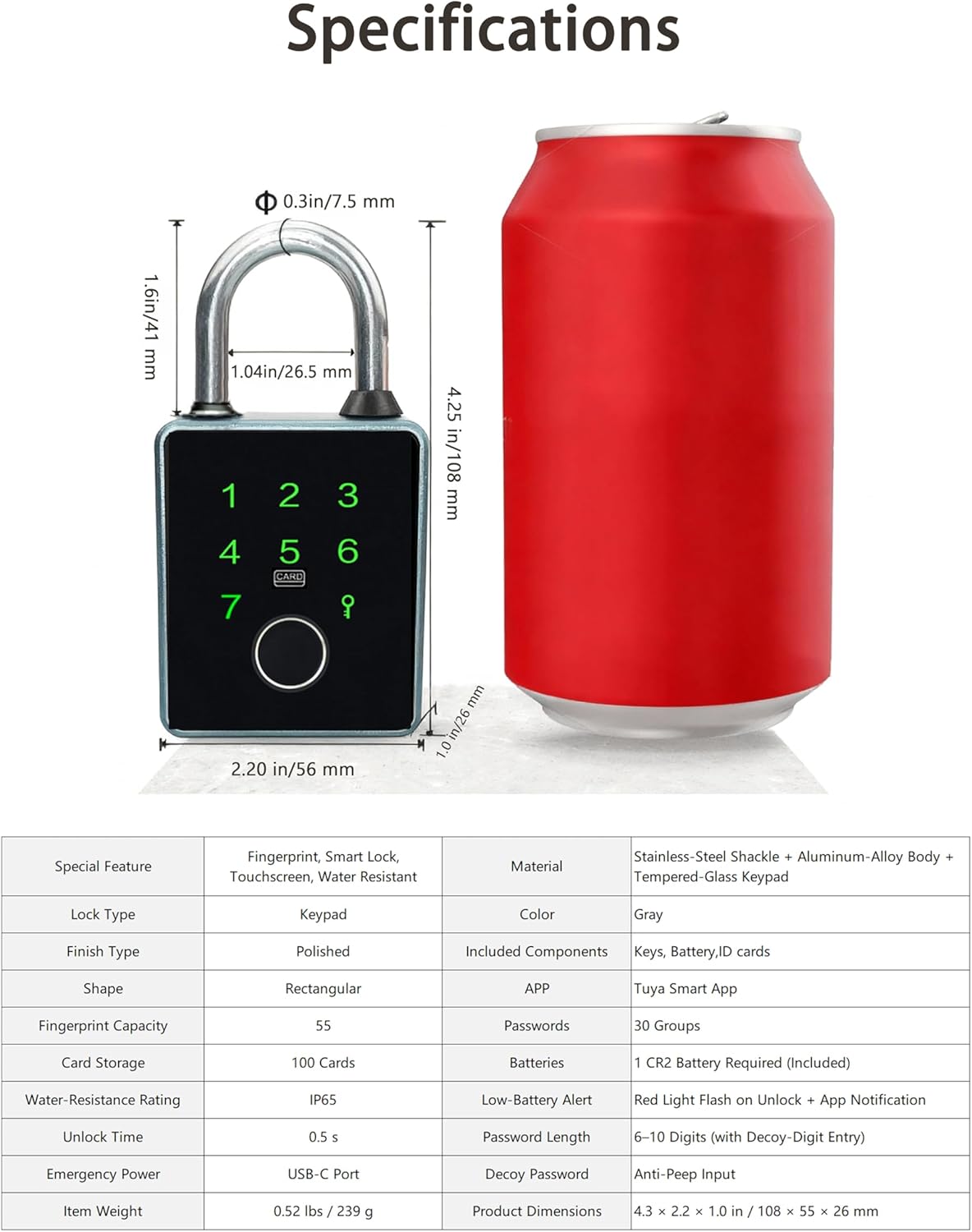 Product Brief Unlock life’s next level with this 6-in-1 smart padlock: tap a fingerprint, swipe the app, or voice-command Alexa—no key required. Military-grade stainless steel and IP65 sealing laugh at rain, dust, and thieves, while the pocket-size0.52 lb body hides a full-size, night-lit keypad that lets you issue time-sensitive codes to guests in seconds. A single CR2 battery quietly powers a year of adventure, and a micro-USB port plus spare mechanical keys guarantee you’re never locked out. From gym locker to warehouse gate, it’s the last lock you’ll ever need—ready for Airbnb turnovers, bike commutes, and every journey in between.Package: - 1 × Fingerprint Padlock - 3 × ID Cards - 1 × CR2 Battery - 2 × Mechanical Keys - 1 × User ManualSpecifications: - Special Feature: Fingerprint, Smart Lock, Touchscreen, Water Resistant - Material: Stainless-Steel Shackle + Aluminum-Alloy Body + Tempered-Glass Keypad - Lock Type: Keypad - Color: Gray - Finish Type: Polished - Included Components: Keys, Battery,ID cards - Shape: Rectangular - APP: Tuya Smart App - Fingerprint Capacity: 55 - Passwords: 30 Groups - Card Storage: 100 Cards - Batteries: 1 CR2 Battery Required (Included) - Water-Resistance Rating: IP65 - Low-Battery Alert: Red Light Flash on Unlock + App Notification - Unlock Time: 0.5 s - Password Length: 6–10 Digits (with Decoy-Digit Entry) - Emergency Power: USB-C Port - Decoy Password: Anti-Peep Input - Item Weight: 0.52 lbs / 239 g - Product Dimensions: 4.3 × 2.2 × 1.0 in / 108 × 55 × 26 mm