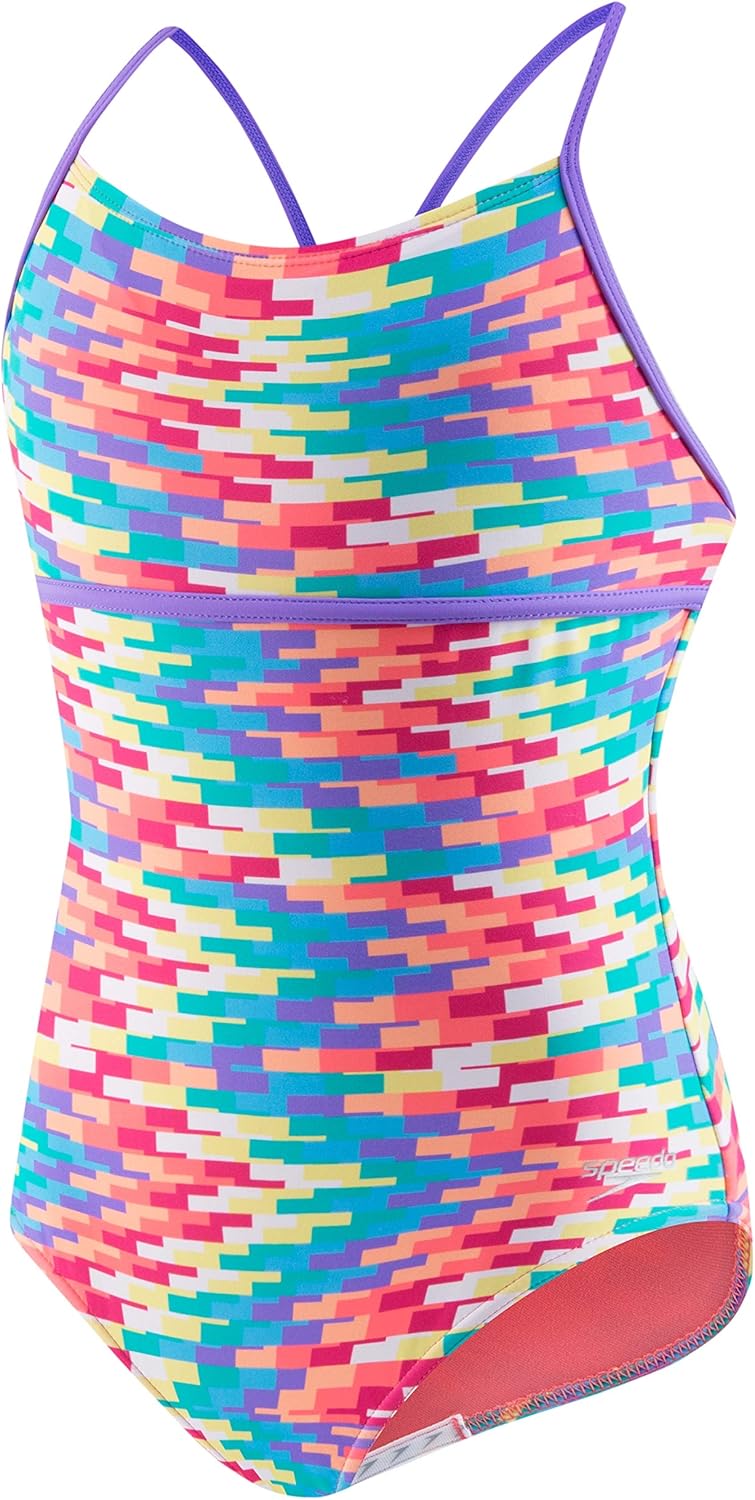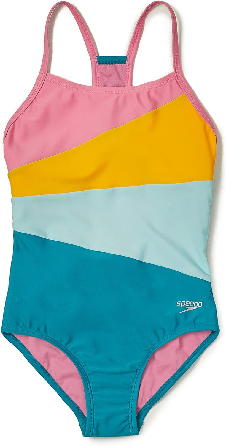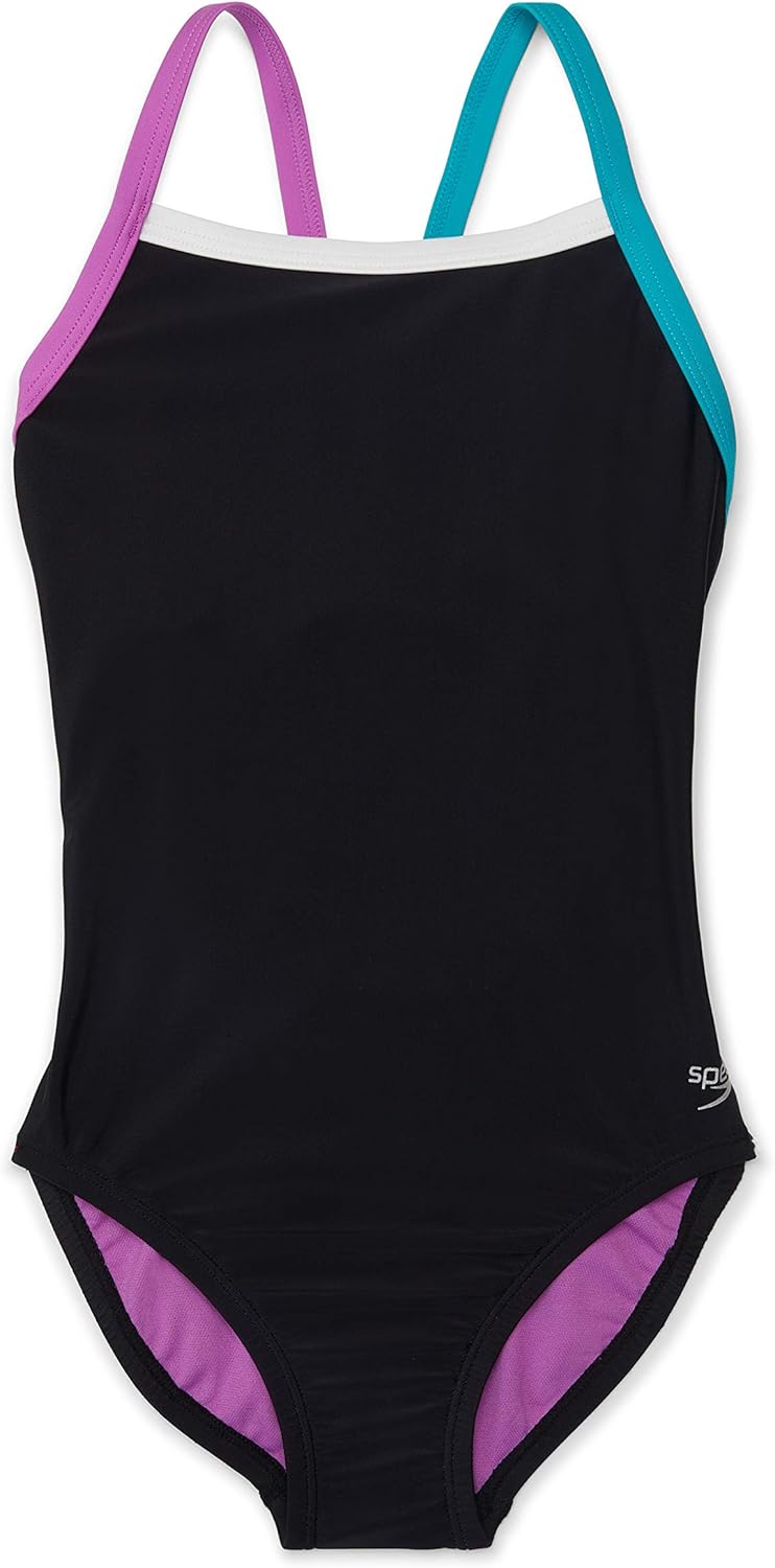 Keep her pool look classic with this solid swimsuit, featuring a colorful logo graphic. It's made from fabric that resists chlorine and pilling for durability that can withstand splashes and washing. Finished with Block the Burn UPF 50+ sun protection, this suit has it all.