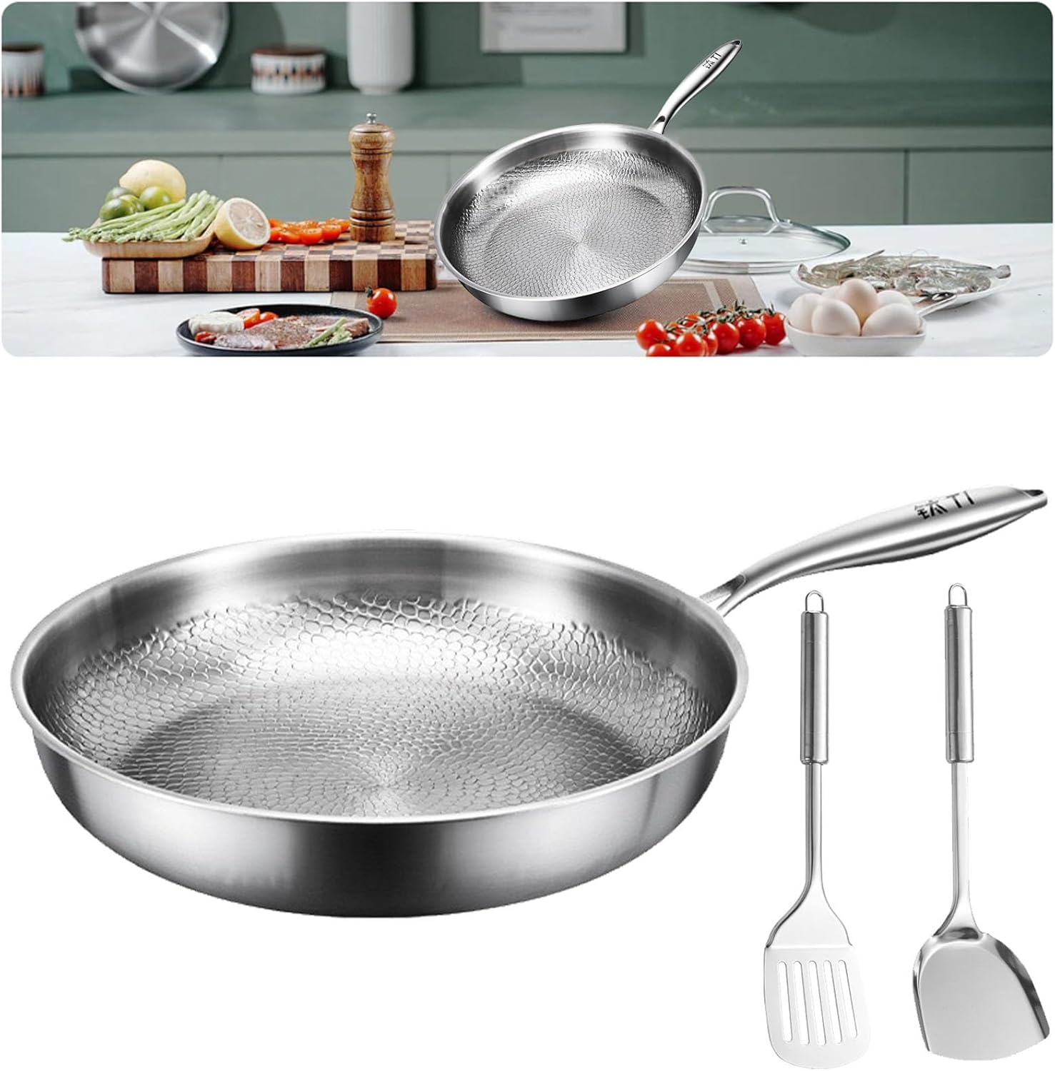 Titanium Hammered Pan Pro, Titanium Cookware, Multifunctional Pots and Pans Set, Non Stick TitaniumFrying Pans for Cooking (With Cover, 11.02in)