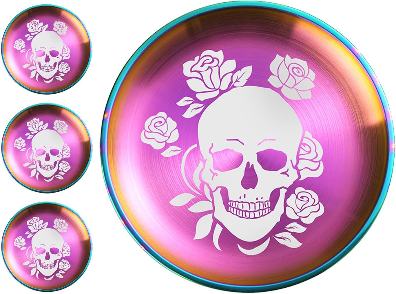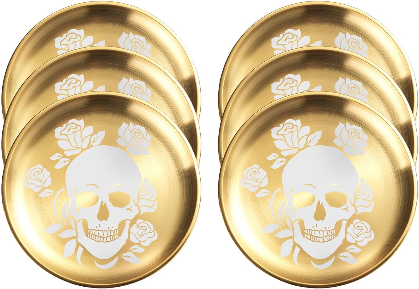Are you looking for a durable and fancy Halloween dinner plate? You'll find it in here. The skeleton dinner plate is a collection of metal dinner plate that draw inspiration from Halloween themed, perfect for use at Halloween parties or other themed events. With gothic skull pattern, these plate exude a lifelike quality and add a unique decorative element to the dining table. Made from durable metal, these plate are long-lasting and can be reused. Whether used as functional plate or ornamental pieces, this skull dinner plate adds a touch of macabre and whimsy to Halloween parties or themed events. Product Detail Material:Stainless Steel Shape:Round Color:Silver, Gold, Rainbow, Black Serving for: Meals, Snacks, Barbecue Steaks Product diameter:8.07 inch / 20.5 cm Thickness:0.57 inch / 1.3cm Number of Pieces:6 Pieces Is Microwaveable Safe: No Is Dishwasher Safe: Yes Upgrade your dining experience with XIAOYU Halloween metal dinner plates! Made of high-quality 201 stainless steel, these plates are completely safe. With a vintage Halloween gothic design, they are perfect for serving Halloween parties, Goths, Witches, Easter, Christmas, Thanksgiving and more. The plates are dishwasher safe and shatterproof, making them perfect for daily use. The smooth round edges without rough spots won't hurt your soft skin, and the appropriate size and lightweight make them easy to handle. The plates are sturdy, durable, and reusable, saving you money and helping the environment by avoiding disposable plates.